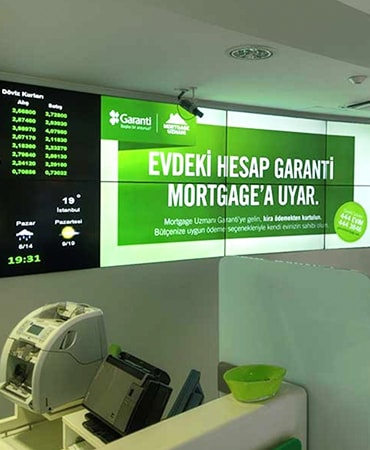 VDisplay VideoWall solutions composed of 46” narrow bezel, special design industrial screens have been mounted on the walls behind the counters in Ataturk Airport, Suadiye and Bodrum branches of Garanti Bank, which have intense client volumes.